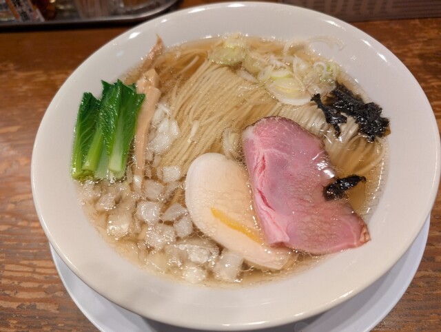 新宿三丁目駅の出口と直結した立地で便利です。カウンター席のみのお店はほぼ満席でした。煮干そばの塩を並盛りで注文。着丼と同時に、麺線の美しさに感動です。塩ラーメンのスープはなめらかで優しくて、上品な美味しさです。刻みタマネギ、柚子の皮と一緒にスープを含むと、それぞれがアクセントとなって、また一味違う風味が生まれます。豚と鶏の薄切りチャーシューが一枚ずつ。それぞれがふっくら柔らかく、お肉の繊細な旨味を味わいました。