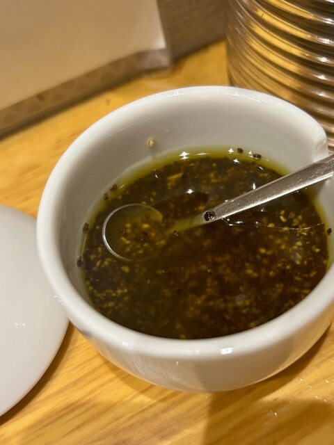 最初はそのまま後半はトッピングの煮卵やお肉を乗せて食べその後は味変に卓上にあるニンニク黒胡椒オイルをかけて食べると全然違う味に!びっくり♪