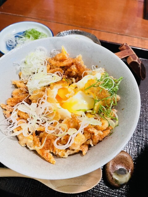 丁度良い塩梅のタレが桜海老と半熟卵に凄く合います。少し小ぶりの丼ですが蕎麦と一緒に食すには