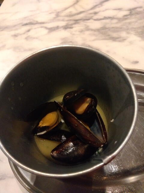 スパークリングのグラス、エスカルゴ、ニースサラダ、ムール貝、牛ほほ肉の赤ワイン煮込み、ラザニア、白ワインのグラスを注文。