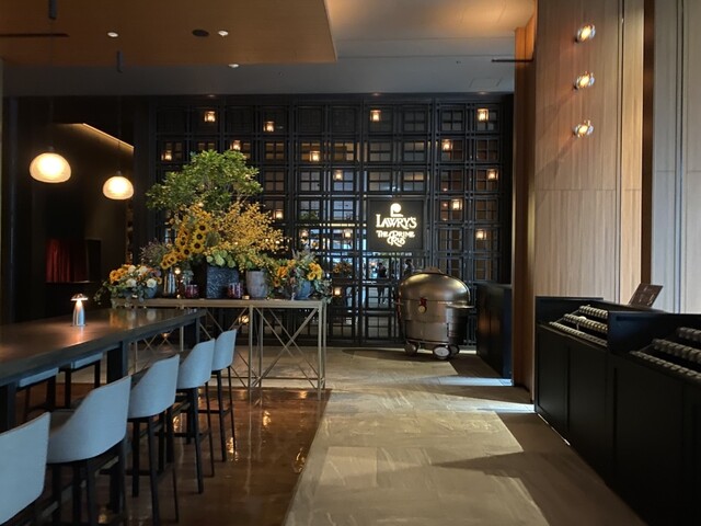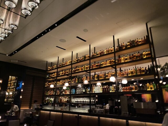 お店の前には、これまたお洒落なバーラウンジがあります。待ち合わせや食後にも使えそうな空間でした。さらに店内はダークで落ち着いた高級感漂うインテリア、天井がとっても高く開放的でありながら、フロアの椅子の背面が高くプライバシーも配慮されているような作りになっておりました。