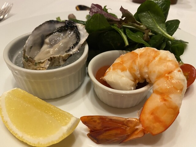 ・メスクランサラダ、ジャンボカクテルシュリンプ、旬菜の生牡蠣