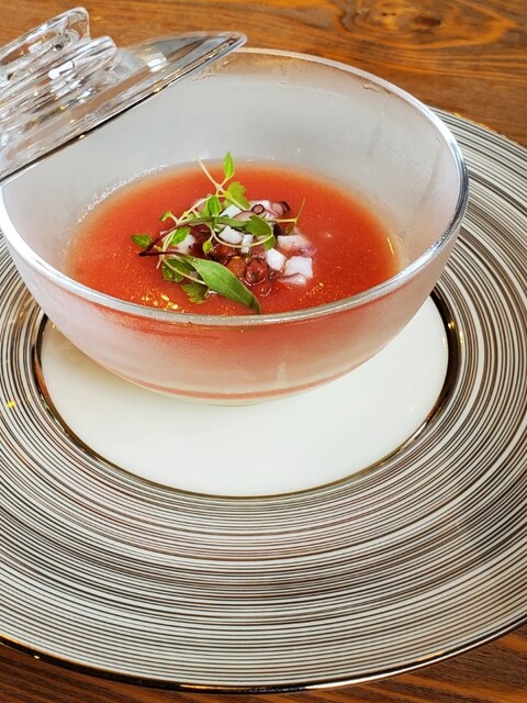 刻まれたトマトとタコあり、食感も楽しめる一品。