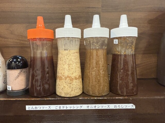 卓上常備されたソース、醤油、岩塩、ワサビ、からし、サラダ用のドレッシング3種を使い、お好みで楽しめる仕様