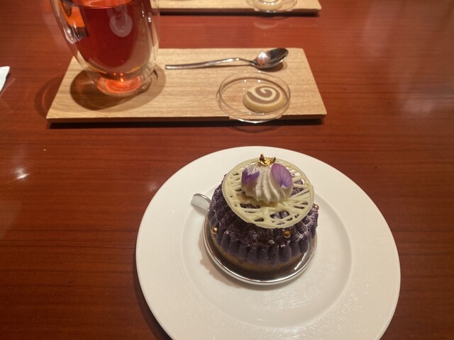 ケーキはショーケースから選ぶことができ,ものによっては追加料金がかかります。今回は紫芋とカシスのタルトをいただきました。甘さがちょうど良くて美味しかったです。紅茶もTWGのもので私はあまり紅茶が得意じゃないので良さがわかりませんがスパイスが効いています。