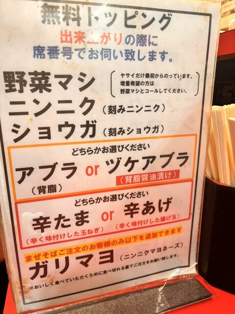19時半頃来店、外は並んでおらず中に6人ほど並んでいました。千里眼とのコラボつけ麺ということでかなり楽しみにしていました。350グラムの普通を注文。コールは野菜、ニンニク、生姜、ズケアブラ、辛たま。野菜の上の油が味がついていて最高でした。スープも独特の味がしとてもおいしかったです。