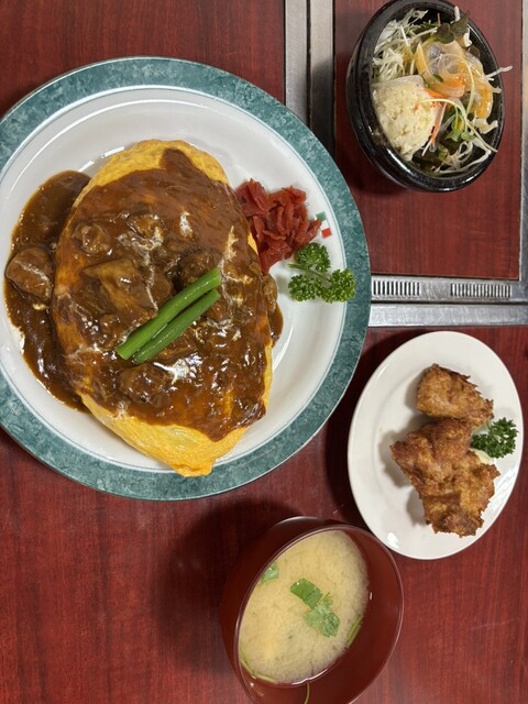 メニューが豊富で悩みましたが、オムビーフライス、妻はビーフステーキ定食200g、単品でさんた唐揚げ3個注文。待ち時間も少なくどれも美味しかった!唐揚げは唐辛子が効いていてビールが飲みたくなりました!ぜひまた来店したいです。