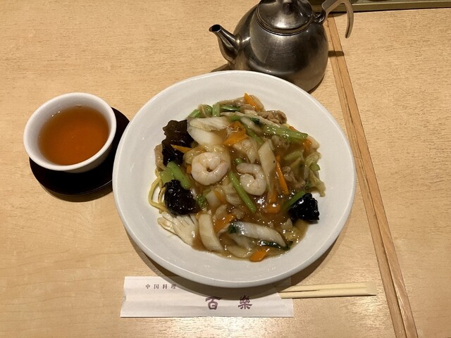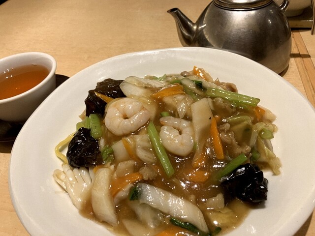 五目あんかけ焼きそばは、極太麺に柔らかい海鮮(海老・イカ)も加わり、町中華より上品な味付け