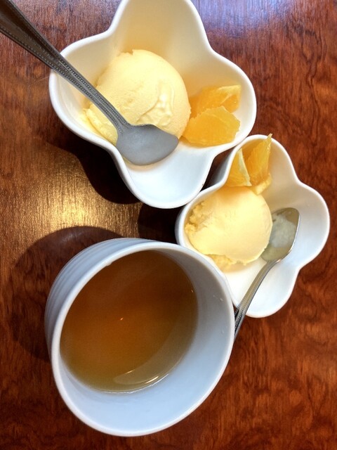「凄くお得なランチで美味しかったね〜」と話しながら、コクのあるアイスクリーム+オレンジのデザートで〆