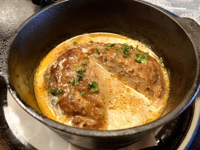 初めて見る鋳物の器に、煮込みハンバーグが熱々で提供