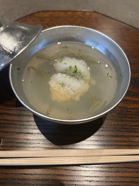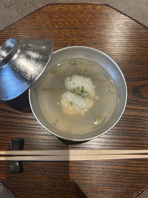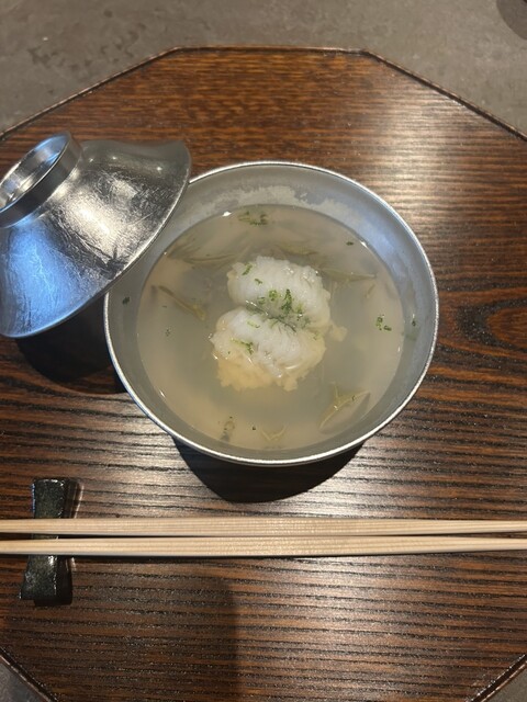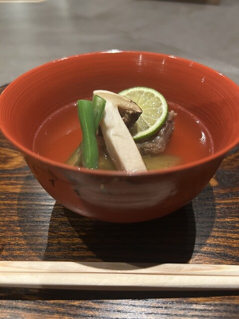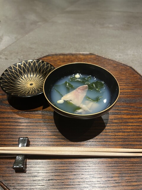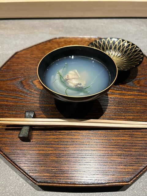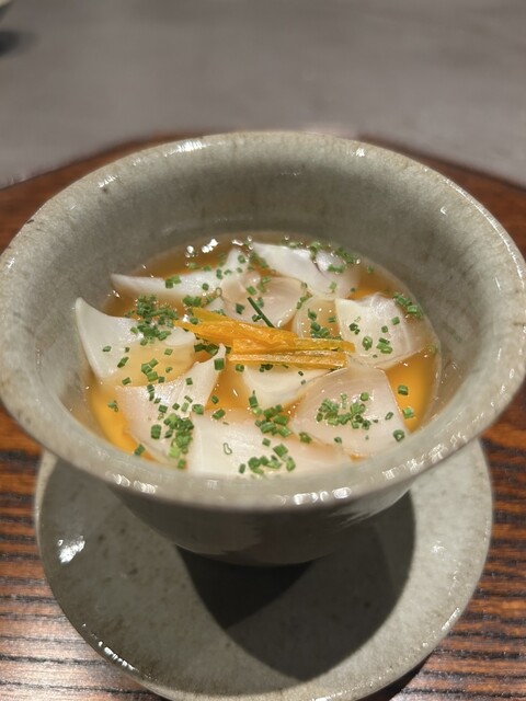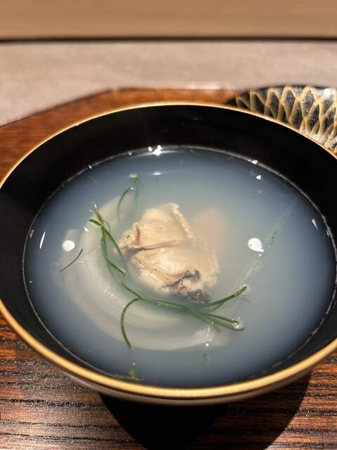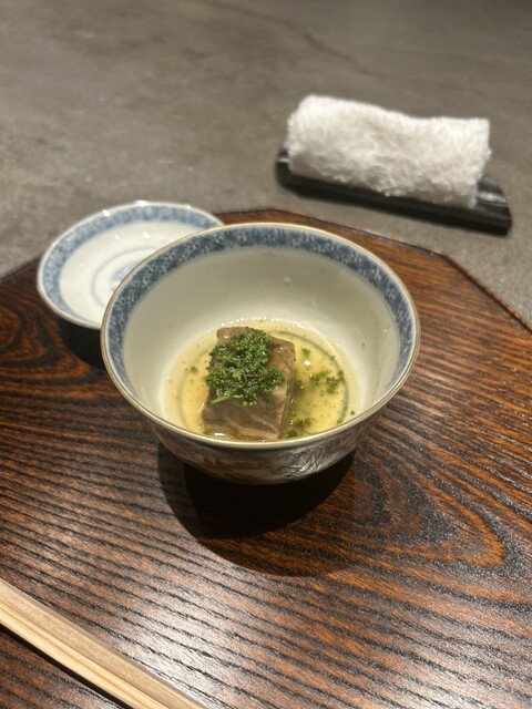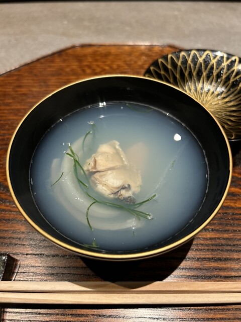 食前に見せられた大粒な蛤がお碗で登場。蛤の濃密な旨味が溶け込んだ吸い地に、淡路島産玉葱の自然な甘みが加わる。青柚子の香りが全体をすっきりとまとめ、極めて完成度の高い椀物。