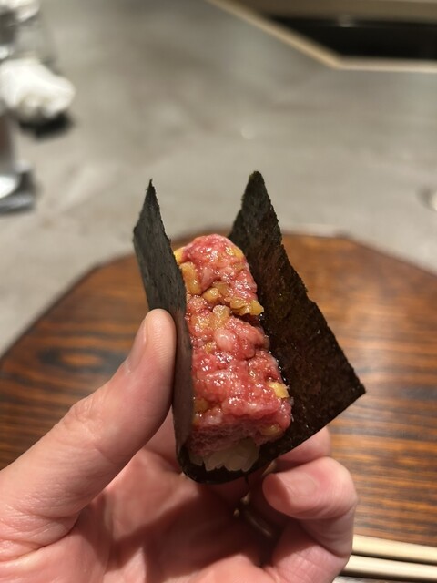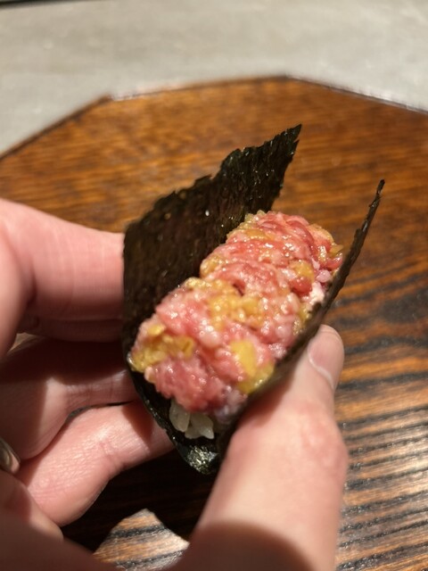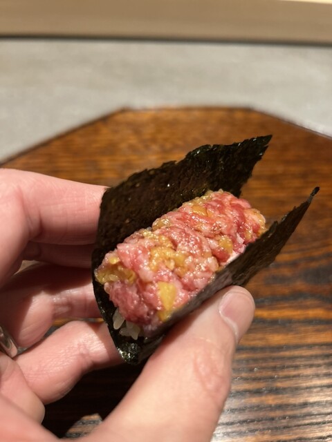 神戸牛サーロインの生肉と刻んだ沢庵を、酢飯とともに手巻きにした一品。パリパリの海苔、神戸牛の甘みを含んだ脂、沢庵の歯応え、酢飯の酸味のバランスが絶妙で食欲を加速させる、一度食べたら忘れられない一品。