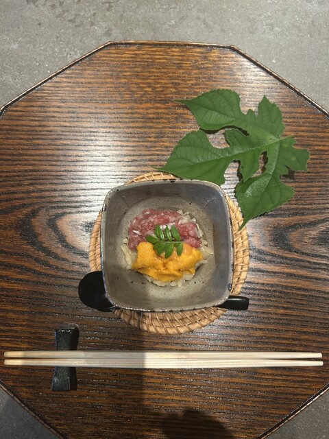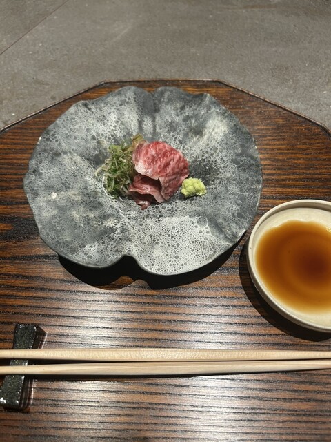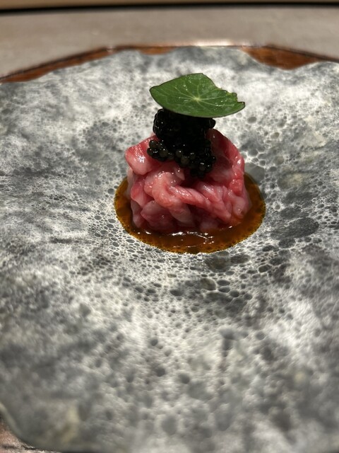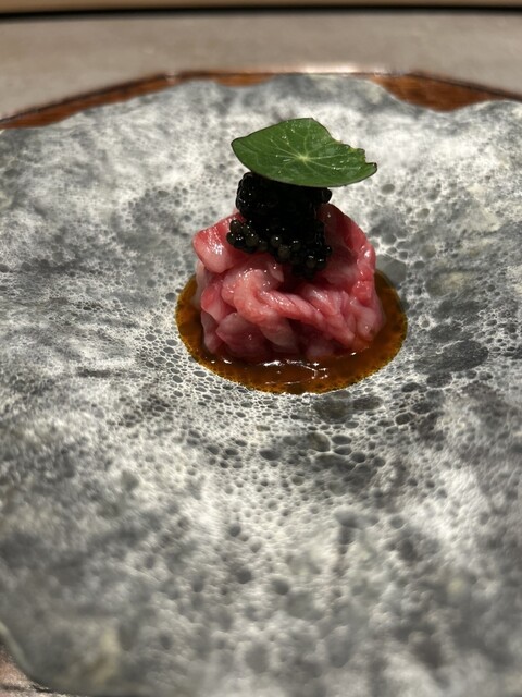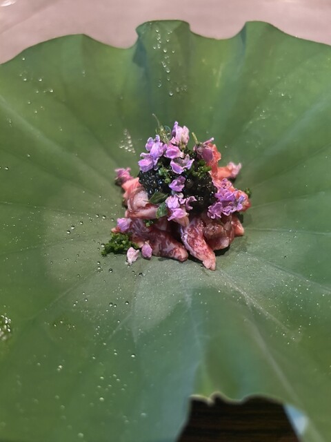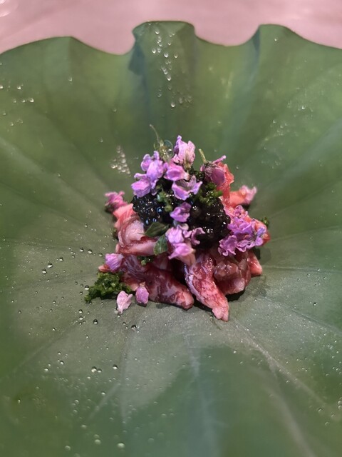 冒頭を飾るのは、蓮の葉に盛られた和牛のタルタルとキャビア。濃厚な旨味の中に紫蘇の花が香り、視覚と嗅覚を一気に刺激する華やかな一皿である。