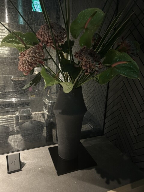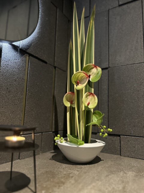 前回と入り口付近の生け花が変わりお店が少しスタイリッシュな雰囲気に。著名な華道家さんが毎週お花を生け替えに来てくれているのだそう。