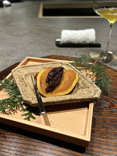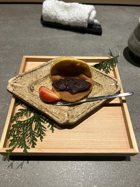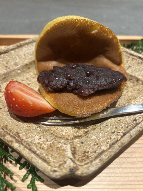 目の前で手作りで焼いてくれる小ぶりなどら焼きは、皮にふわっとした香ばしさがあり、粒を残した餡の炊き加減も絶妙。甘さは控えめで、最後のデザートとして相応しい上品な一品。添えられた苺の酸味が口直しとして秀逸な役割を果たす。