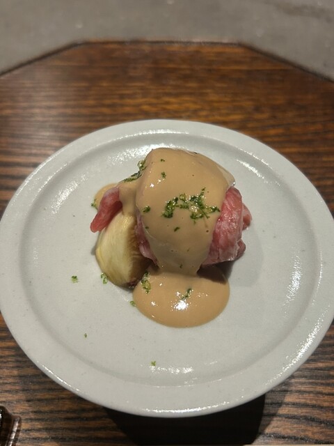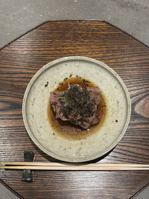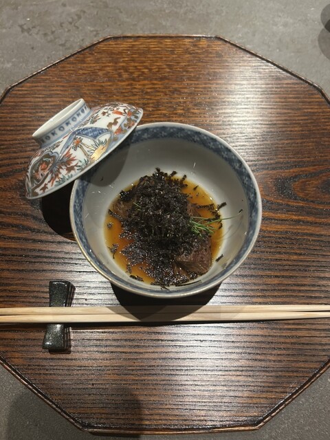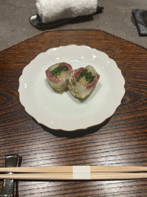 一品目から出し惜しみせずに生肉とホタテの昆布巻き。最初の一口の歯応えと生肉を飲み込んだ後の口に残る肉の甘みが何とも言えない。これだけでもきた甲斐がある秀逸な一品。