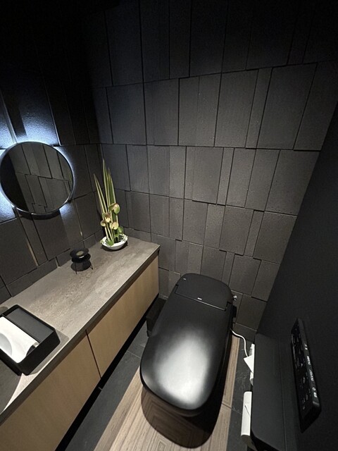 木製の格子、漆黒の天井、特徴的な壁面タイルのコントラストが斬新で、和とモダンの境界線を曖昧にする洗練された世界観が貫かれている。空間自体が料理の一部であり、無駄を削ぎ落とし、研ぎ澄まされた美意識の中で、五感を通して「食」を体験する場所である。