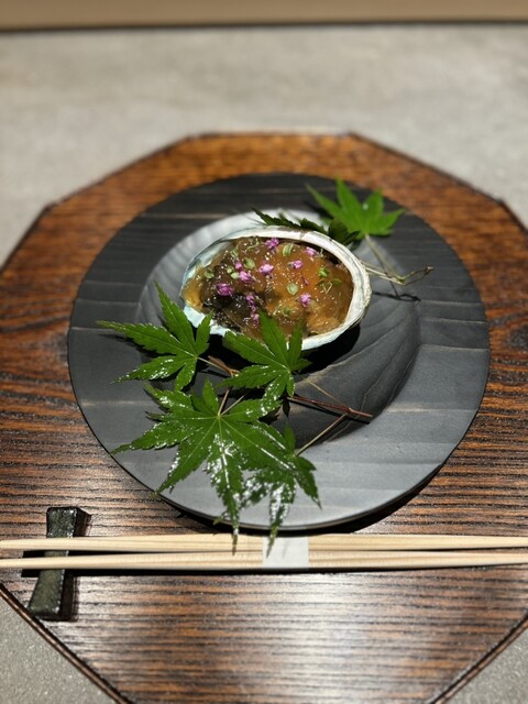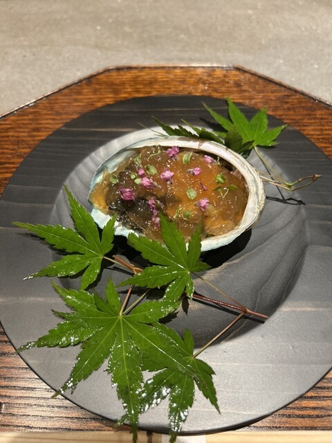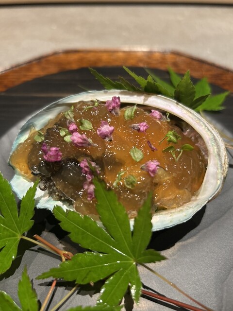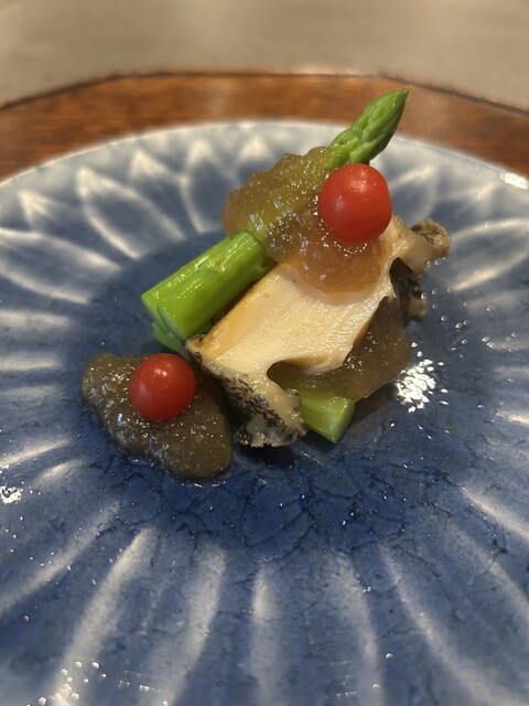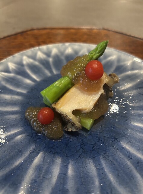 続いて供されたのは、鮑とアスパラに旨出汁のジュレをかけた涼味ある一品。赤い小粒のトマトが彩りを添え、夏らしさが感じられる構成となっている。