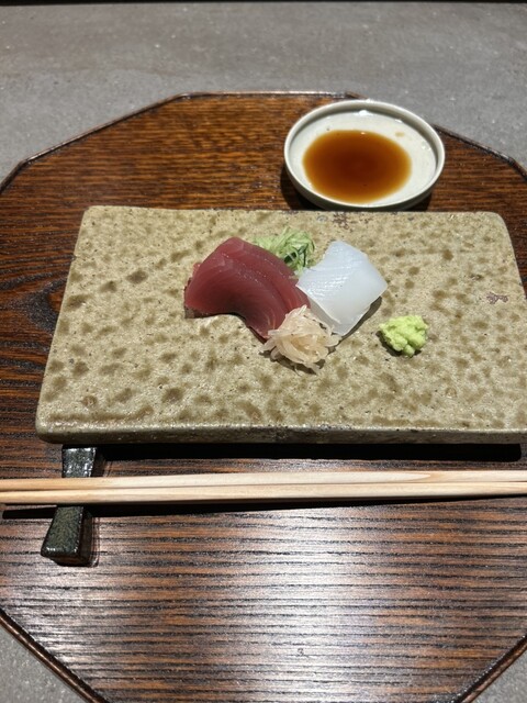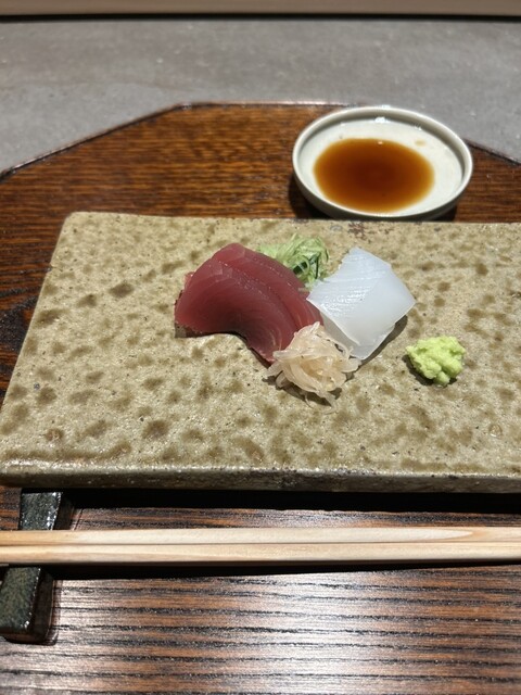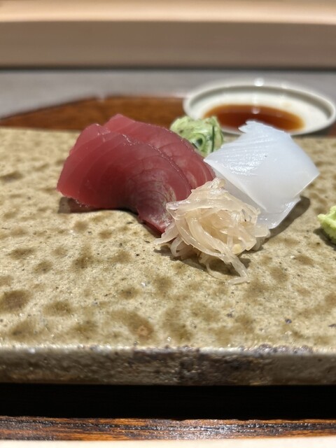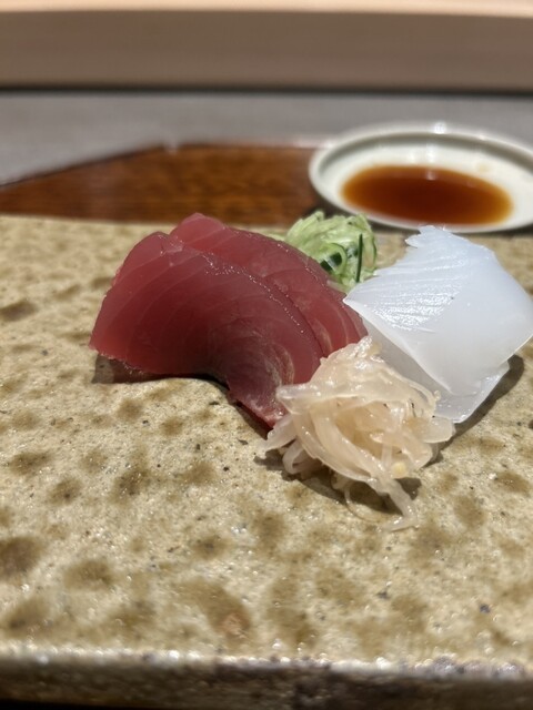 熟成されたカツオはしっとりと滑らかで弾力があり旨味が濃縮されている。対するアオリイカは透明感があり、ねっとりとした甘みが際立つ。針胡瓜と白髪葱の清涼感が、全体を軽やかに仕立てていて、口の中が磯の風味と爽やかさで満たされる。