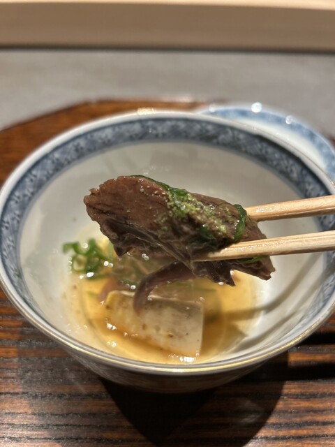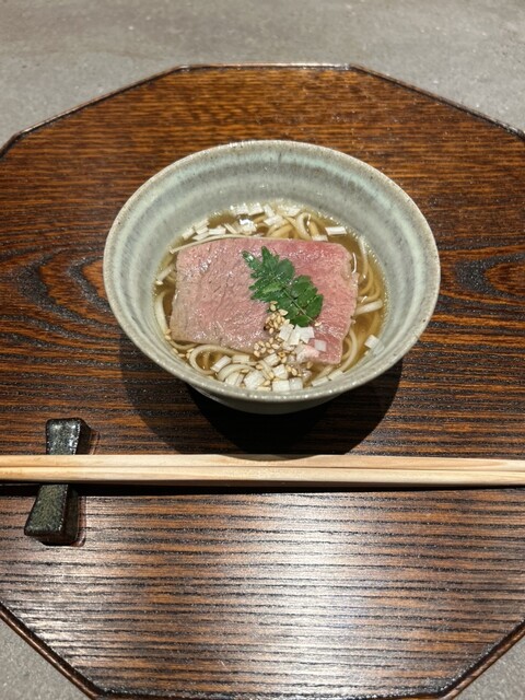 牛出汁をベースにしたつゆは、深みがありながらも過剰な主張はなく、稲庭うどんと絶妙に絡む贅沢な一品。上には薄くスライスした神戸牛のサーロインがのり、白胡麻、ミツバとともに静かな贅沢感を漂わせる渾身の作品。