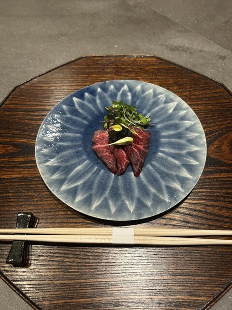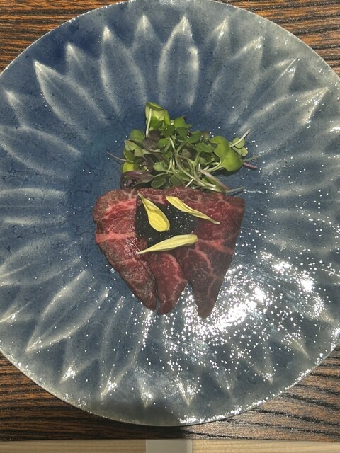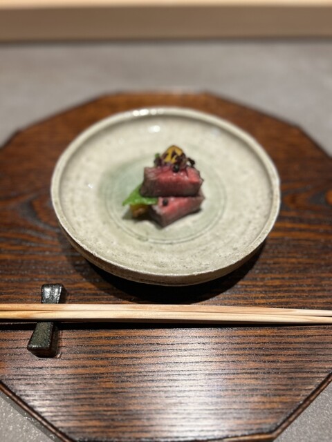 冒頭に供されたのは、和牛の赤身肉にキャビアを添えた逸品である。肉の旨味とキャビアの塩味が絶妙に調和し、花弁の彩りも相まって目にも鮮やかであった。