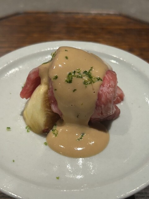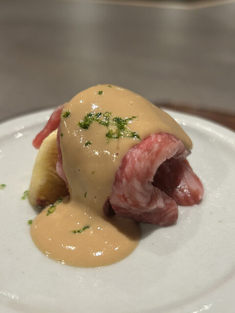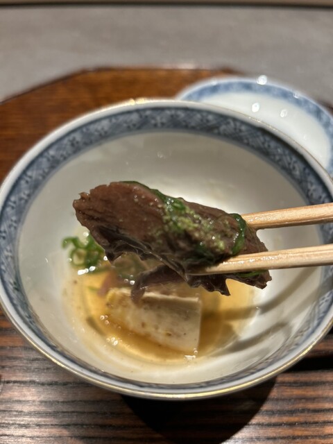 コース料理は、量やスピードがテンポよく、特に気に入ったのは、こだわりの神戸ビーフの生肉のとろたく巻きとこちらも神戸ビーフを4時間以上煮込んだという山椒添えの煮込み。いずれも今まで食べたことのない美味しさで絶品。