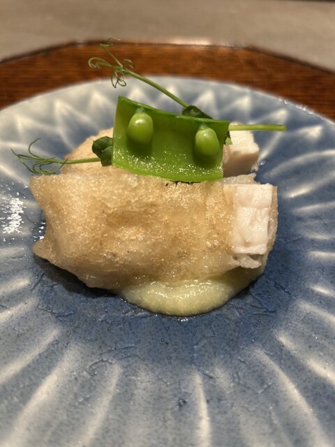 先ほどの法皇キャビアの親となるチョウザメを使用、白身魚らしいふっくらとした身質を、薄衣で包んでサクッと揚げた粋なフライ。醤油麹のソースが旨味を底上げし、青豆と豆苗の装飾が初夏らしい彩りを添える。