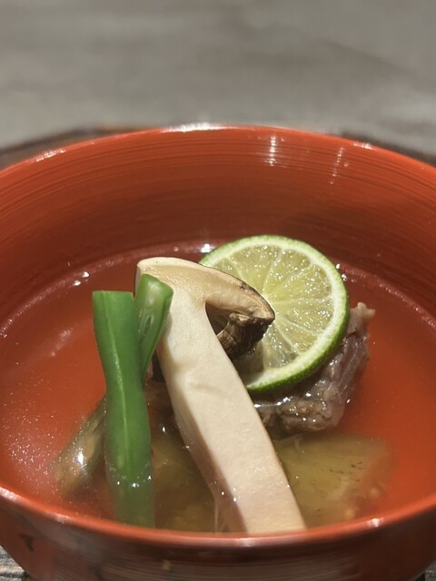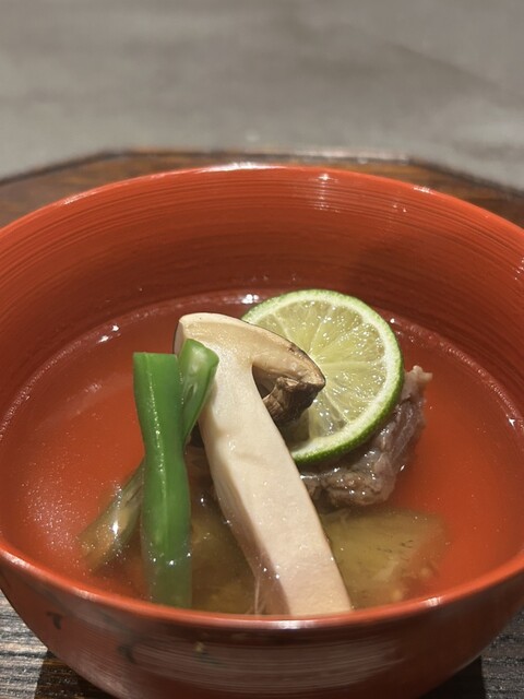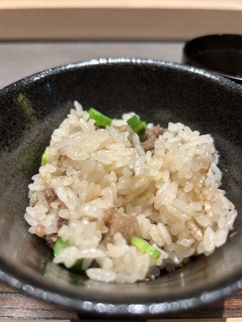 牛の出汁で香ばしく炊き上げられたご飯に、細かく刻まれた和牛と旬のアスパラ。肉の脂が米一粒一粒に染み込みながら、アスパラの青さが後味を軽やかにしている。噛むほどに米と肉の旨味が一体となり、コースの締めくくりにふさわしい安堵感を与える一椀。添えられた赤出汁も抜かりなく、優しい塩梅が胃を穏やかに落ち着かせてくれる。