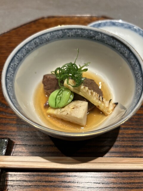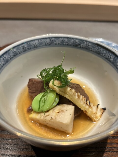 とろけるように煮込まれた神戸牛のほほ肉に、爽やかで清涼感のある山椒を合わせた煮物。出汁の効いたつゆに炙った筍とそら豆を添えた、優しいながらも力強い構成。これだけでも十に食べにくる理由になる絶品である。