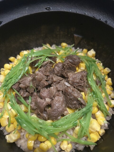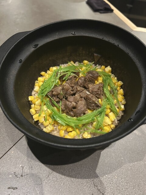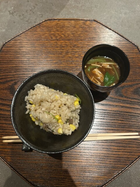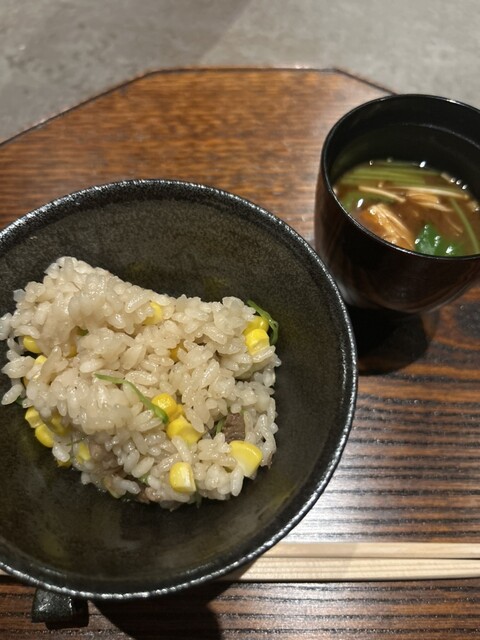 締めは、とうもろこしと牛肉の炊き込みご飯と赤出汁。季節の滋味が凝縮された炊き込みご飯に、身も心も満たされる。