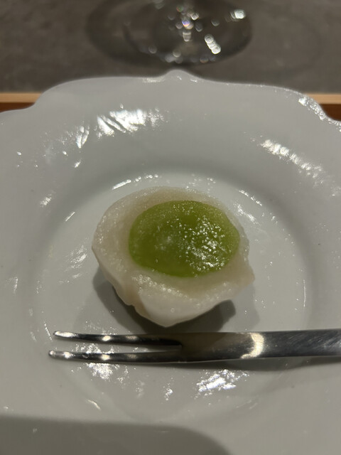 甘味はシャインマスカットの大福。瑞々しい果実ともちもちの求肥が口内で溶け合い、爽やかな余韻を残す。