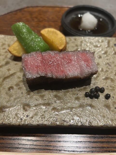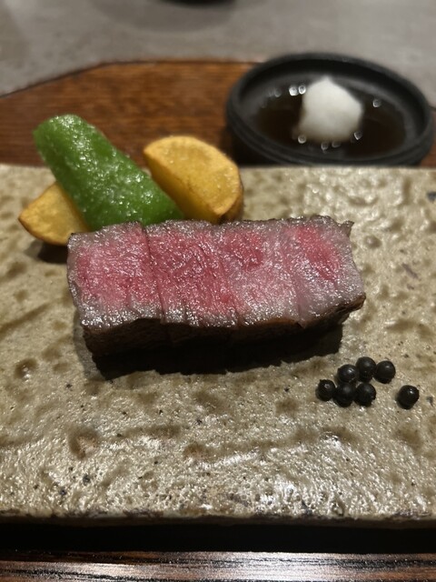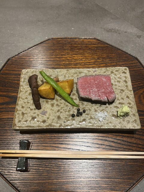 表面は香ばしく、中心はロゼ色に仕上げた神戸牛。噛むごとに炭香と肉汁があふれ、添えられた季節野菜とともにいただくことで、滋味深い余韻を残す。