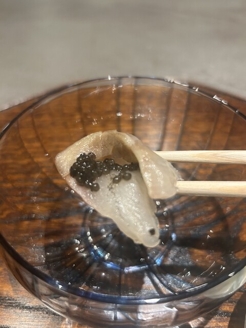 次に出てきたチョウザメのお造りは、刃の入れ方が美しく昆布で軽く締められた絶品。法皇キャビアと相性抜群の親子料理である。