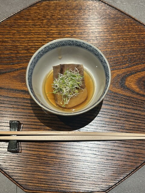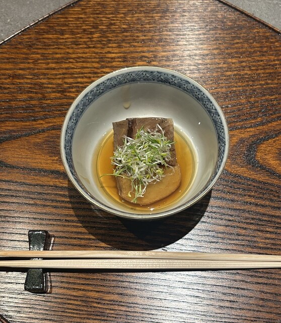 続いては生肉のお刺身。存分に煮詰められた卵黄とともに醤油出汁でいただく一品で、肉の存在感が徐々に前景化していく流れが実に巧みである。