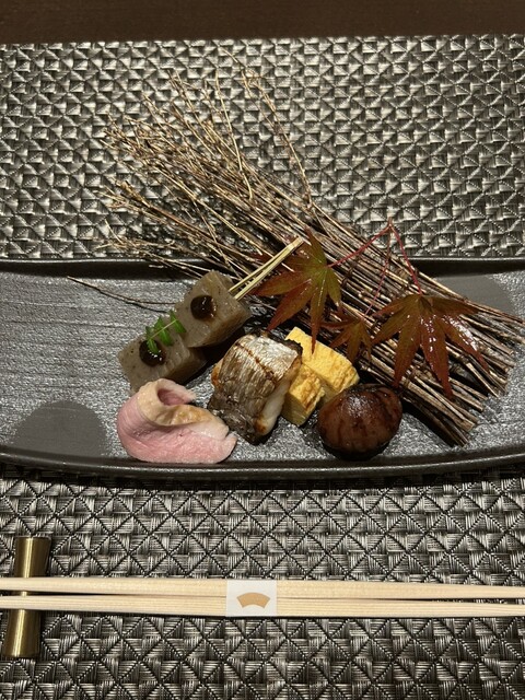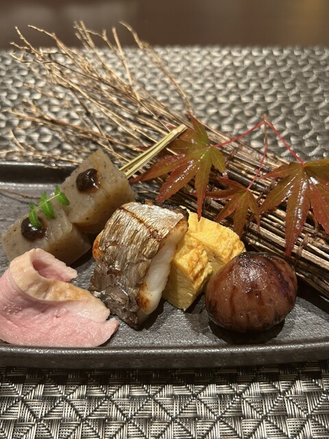 先付「太刀魚と秋の吹寄せ」では、香ばしく焼かれた太刀魚に栗の渋皮煮や江戸風玉子焼きが添えられ、色彩と味わいの双方で秋を表現している。