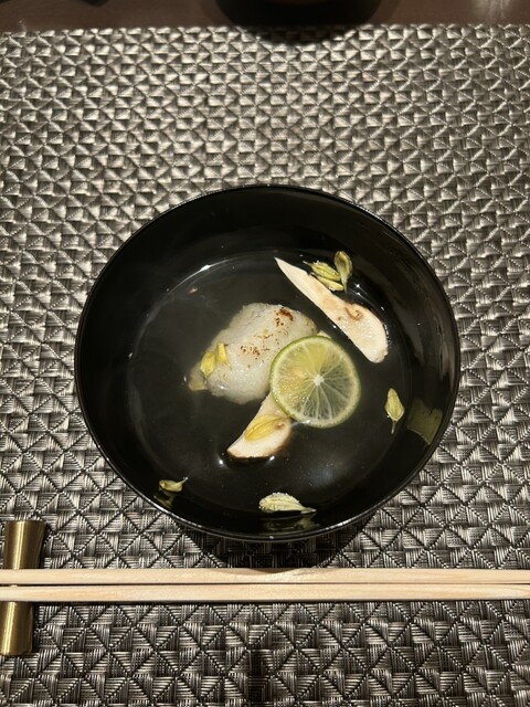 続く椀物は、松茸の香りが立ち上る澄まし仕立て。焼き目をつけた鱧と酢橘が加わり、上品で奥行きのある味わいを楽しませてくれる。