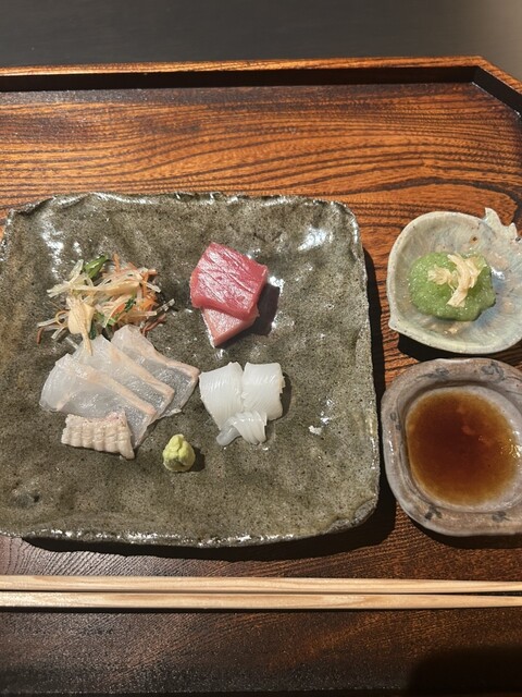お造りは鮪、烏賊、かれいの三種で、切り付けの美しさと鮮度の良さが際立っていた。特に烏賊は包丁仕事が素晴らしく、ねっとりとした甘みが際立つ。生姜の効いた和え野菜と合わせて食べると味に深みが増し、全体のバランスも秀逸であった。