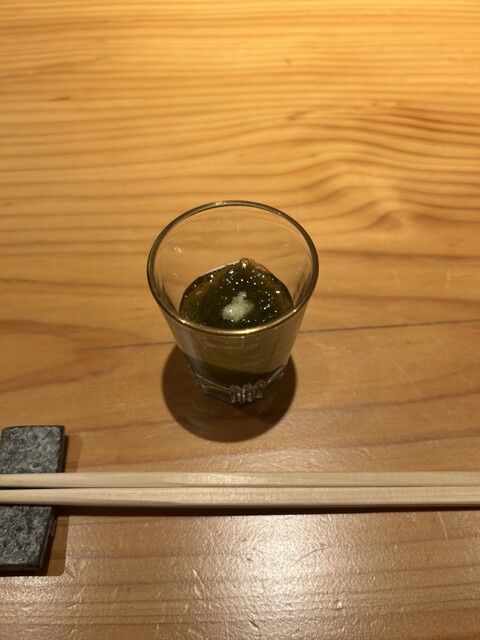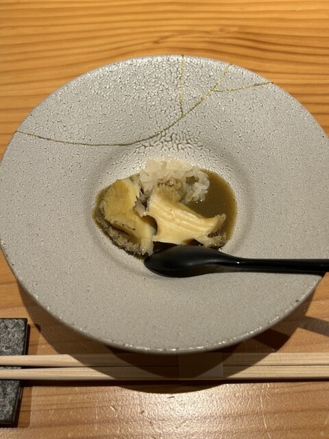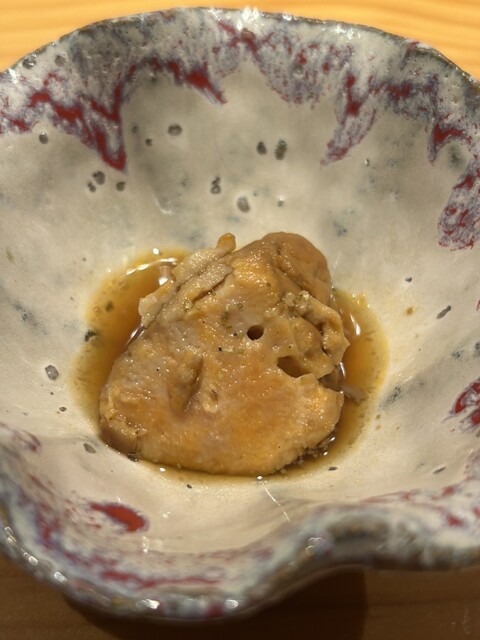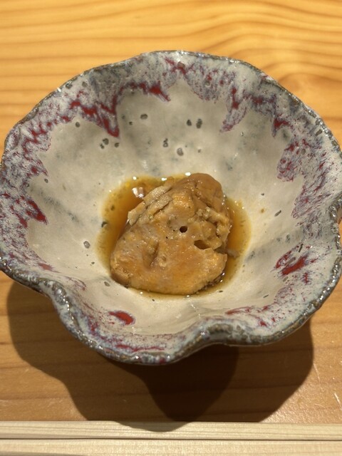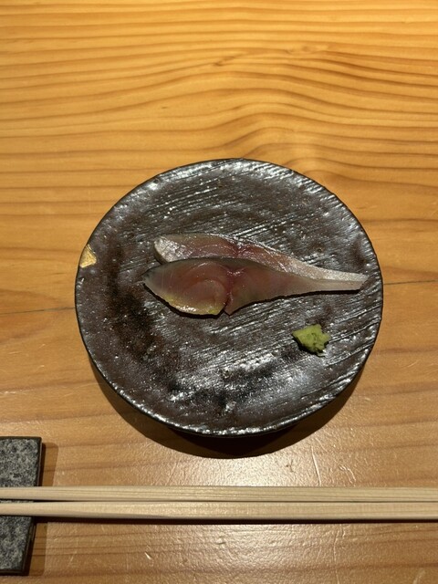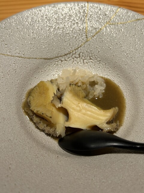序盤には鮑を用いた一品が登場、柔らかな身の旨味に肝の濃厚さが寄り添う。米の食感を残した仕立ても心地よく、早くも店の丁寧な仕事ぶりが伝わる。続く白身や光物も切り付けが美しく、特に鯵の艶やかな脂の乗りは見事、。