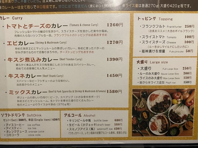 自分が気になったメニューの1つである「牛すじカレー」はこれ以上に辛いとのことなので、辛さに自信がない方はこのトマトとチーズがベストな選択かもしれません。