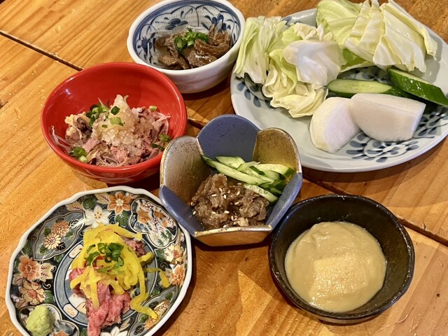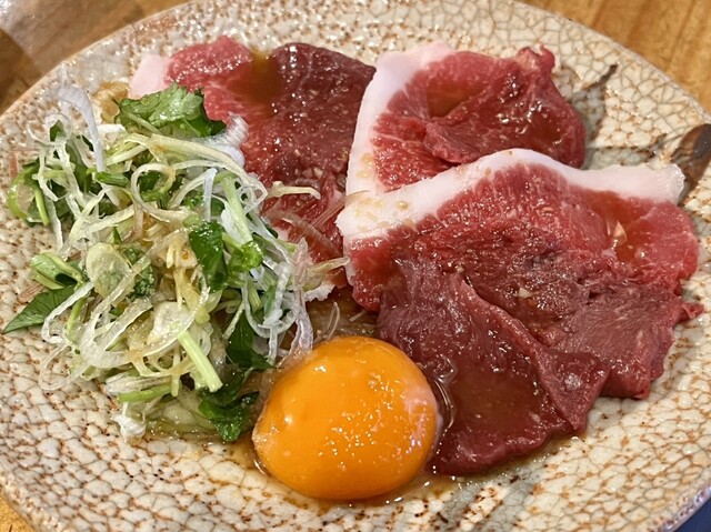 馬肉といえばもうここしかない(*^ω^*)今回は3200円の食事コースに1800円の飲み放題をつけて5000円で♪初めてコースで入りましたが最初にコースで入るべきだったか、いままで食べてきたお気に入りメニューが詰まってる(〃ω〃)そんで2人で行ったけどこの量はエグいて笑 大将いつもありがとうございます♪