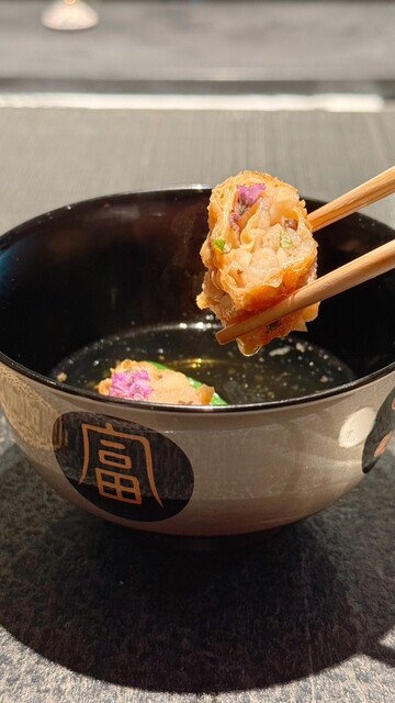 お椀:車えびの湯葉巻き揚げ 甘海老の出汁