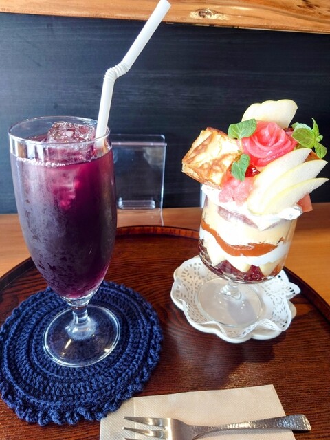 グレープジュースとキャラメル香るリンゴのパフェを注文(ドリンクセット)