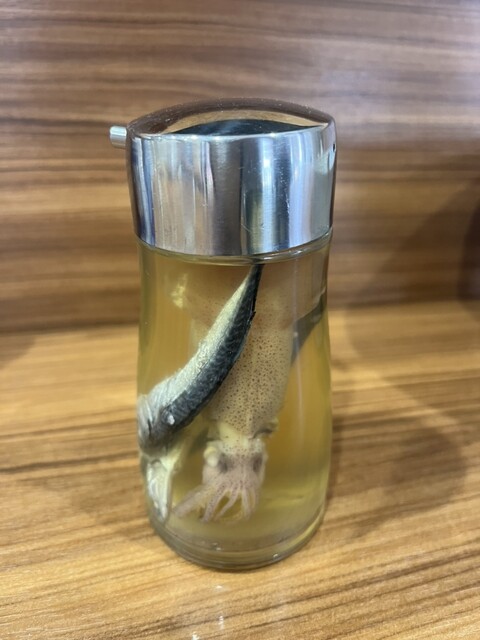 良くまぜまぜしてからいただきます。うん美味い!替え玉目当ての人が多いのも納得です。お好みで特製のお酢で味変もおすすめです。このお酢、煮干し?とイカが漬けてありました。このお酢美味しい。お酢すめですw