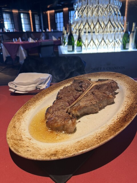 Tボーンステーキ! お皿を斜めにしてバター(ソース)を集めている