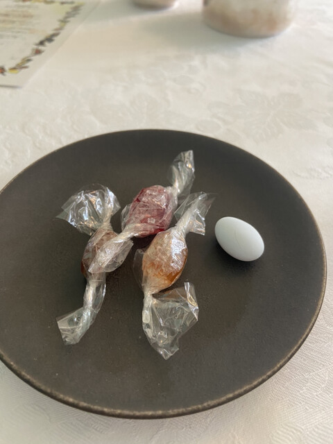 ゼリー、キャラメル、アーモンド、ミントのマシュマロがあり、マシュマロ以外のものを全ていただいた。どれもかなり甘めで普段はあまり食べないものだけど、この甘さが食事の締めって感じがしたのと、一つ前のデザートの時からいただいているハーブティーがかなりすっきりしているので、重さをさほど感じずよかった。