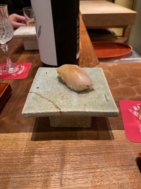 コースが始まる時間に合わせて炊き上げられたピカピカのお米に目の前で酢を混ぜ、その時点での味を確かめさせてくれる。やはり混ぜたては酸味が強いが、時間経過とともに酸味は落ち着くそうで、その時点のシャリに合うようにネタの順番を組んである様子。また、ネタの温度も魚の体温くらいに戻してあるようで、魚の筋肉がリラックスした状態で食べれる。