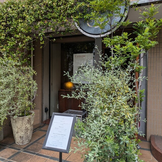 お店の入口は緑に囲まれていて