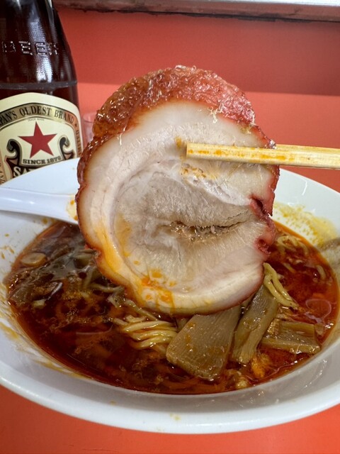 自家製辣油にニンニクが利いた、旨辛いラーメン。見た目の色の印象と違い、辛いものがそんなに得意でない私でも美味しいと感じる程よい辛さでした。