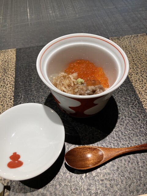 しゃぶしゃぶされたものを器に入れてくれて、松茸の香りとお出汁の風味と近江牛の脂の甘味を楽しめる美味しさ満載の一杯。