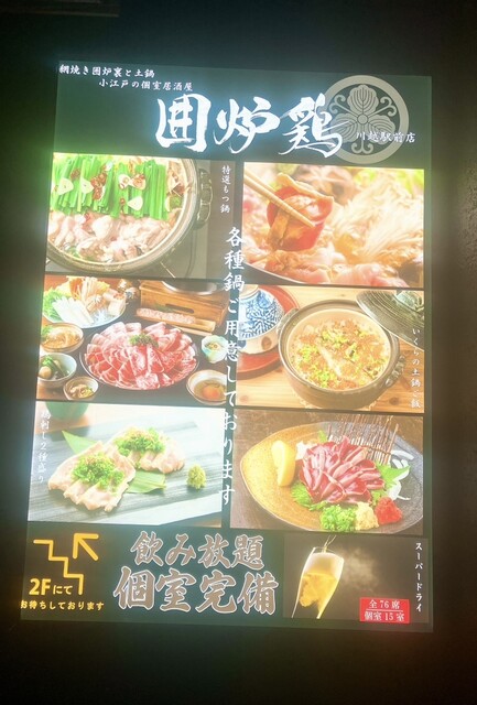 川越駅からほど近い場所に佇むこちらのお店。囲炉裏の温かみと個室の落ち着いた空間が相まって、ゆったりと料理を楽しめる雰囲気が魅力です。